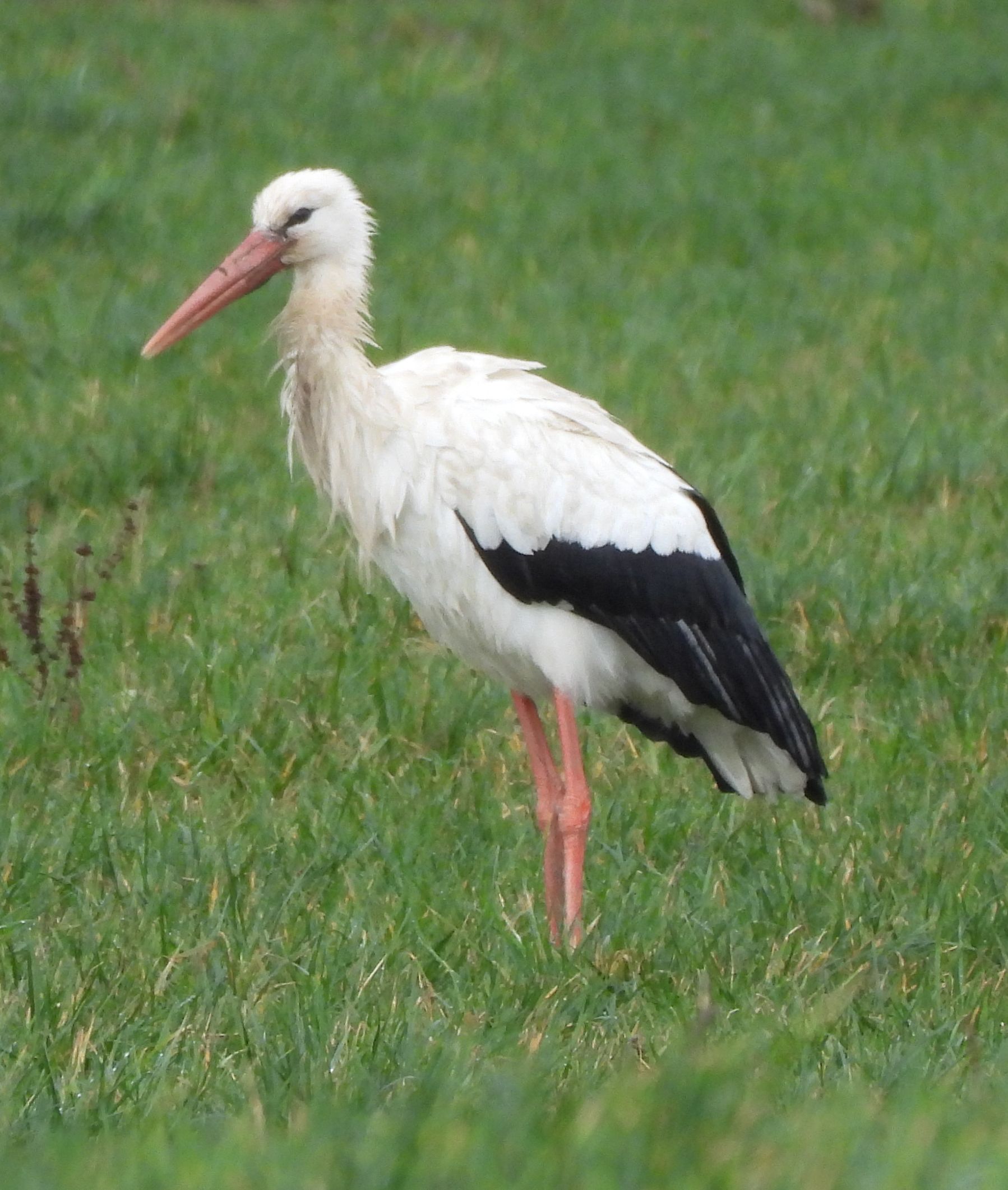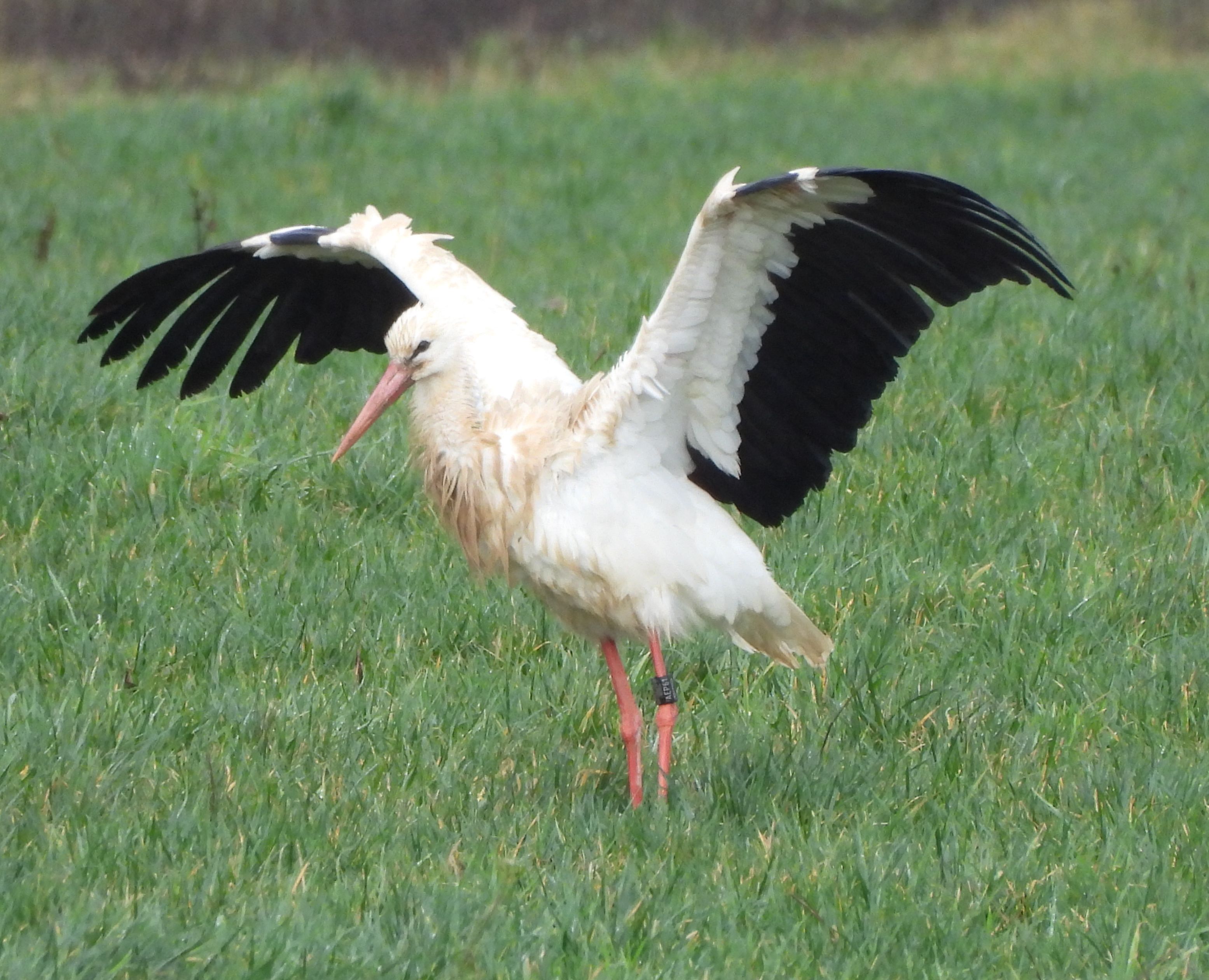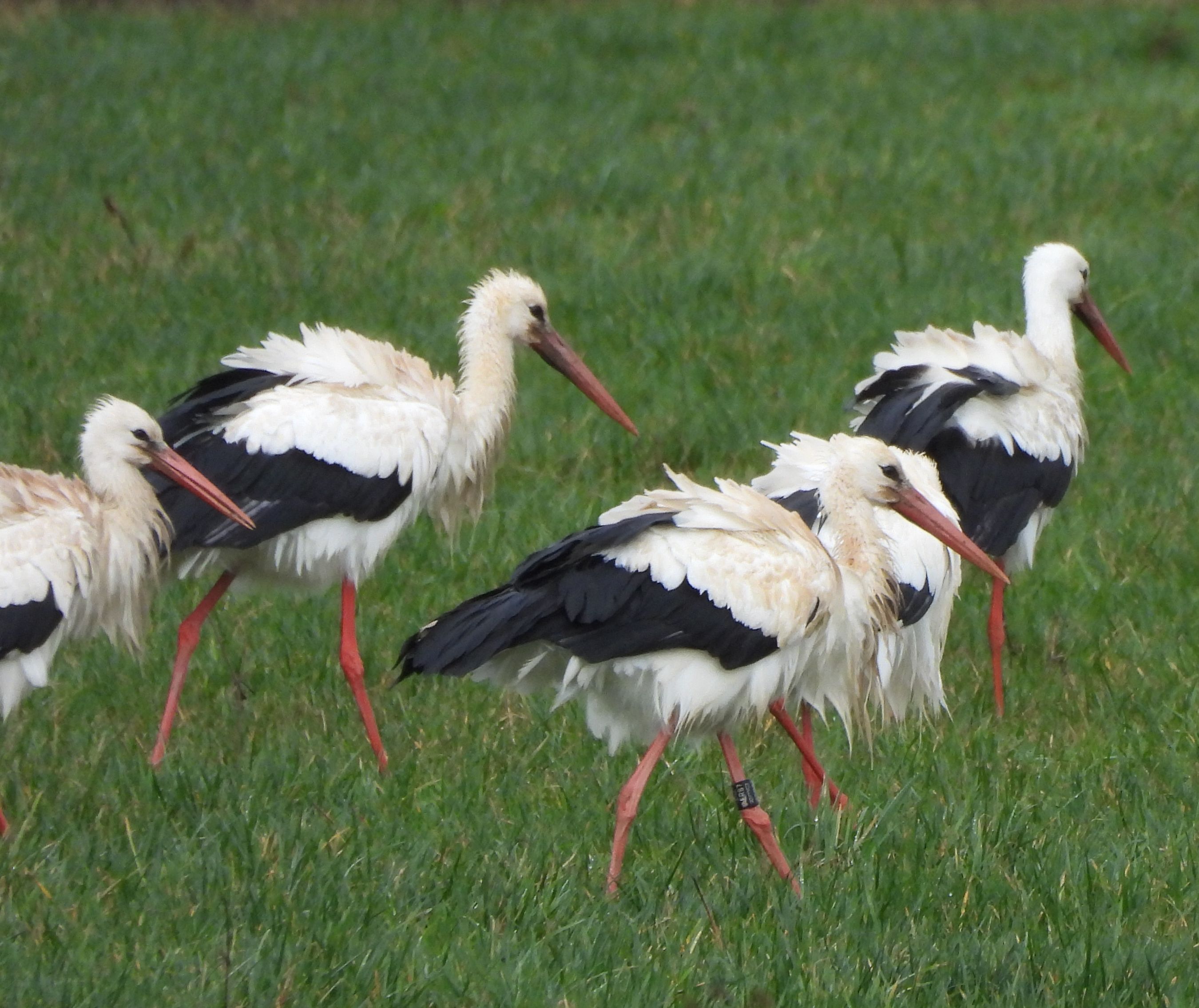Yesterday my daughter told me she’d seen storks out by the Divonne exit of the motorway. It was raining, as usual this year, but I grabbed my camera and got out there. Sure enough in the field by the motorway, on the Swiss side, there were loads of them. Sheena counted 28 in the first flock, about 300m from where we parked. There was a second flock of about 40 much further in. I set off to get nearer. The field was soaked and I was almost wading to get nearer. They all looked very scruffy and are certainly resting in the course of their long journey back to Northern Europe. Of course they decided to escape the paparazzi and as I approached, one by one, they took to the air. Flying off to join the larger congregation half a kilometre away. The wingspan is really impressive!